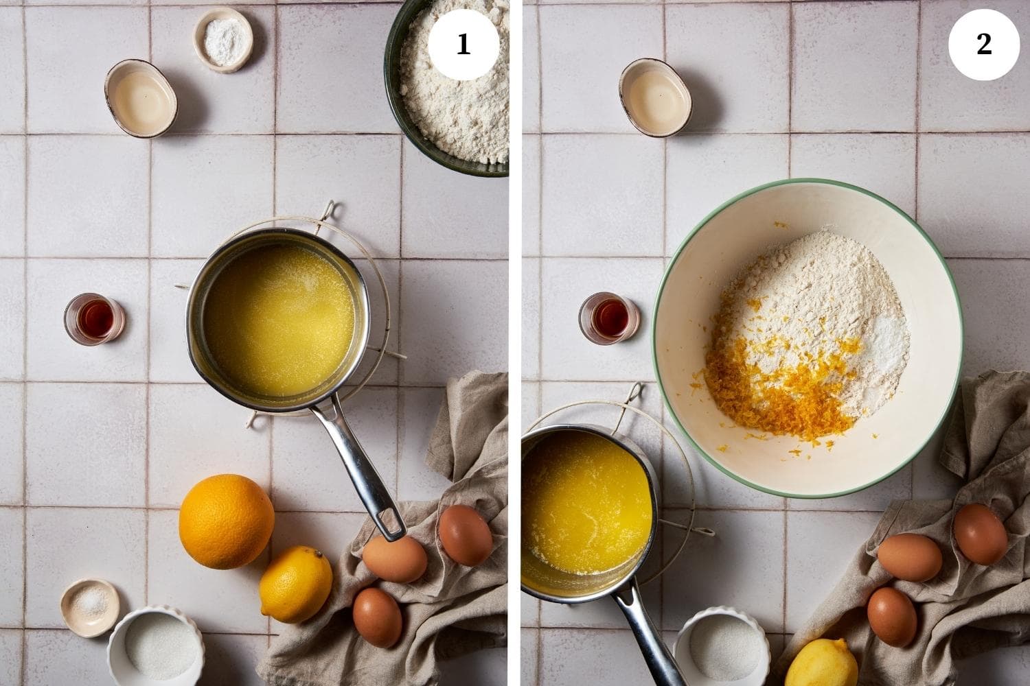 Make the struffoli dough: Melt the butter and leave it to cool (photo 1). In a large bowl, or in a food processor if desired, mix together the flour, orange and lemon zests, salt, and baking powder (photo 2).