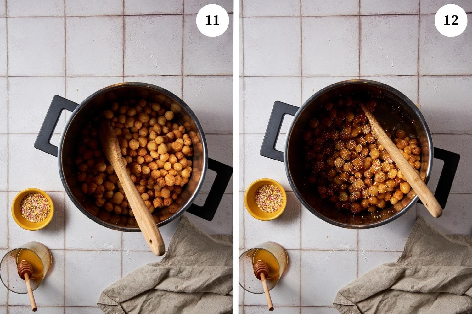 Honey glaze and sprinkle topping: In a very large saucepan, combine honey, confectioner’s sugar and vanilla (photo 10). Heat the mixture, stirring frequently, over low heat with a spoon until the sugar dissolves. Turn off the heat and add all the fried dough balls carefully into the mixture (photo 11).