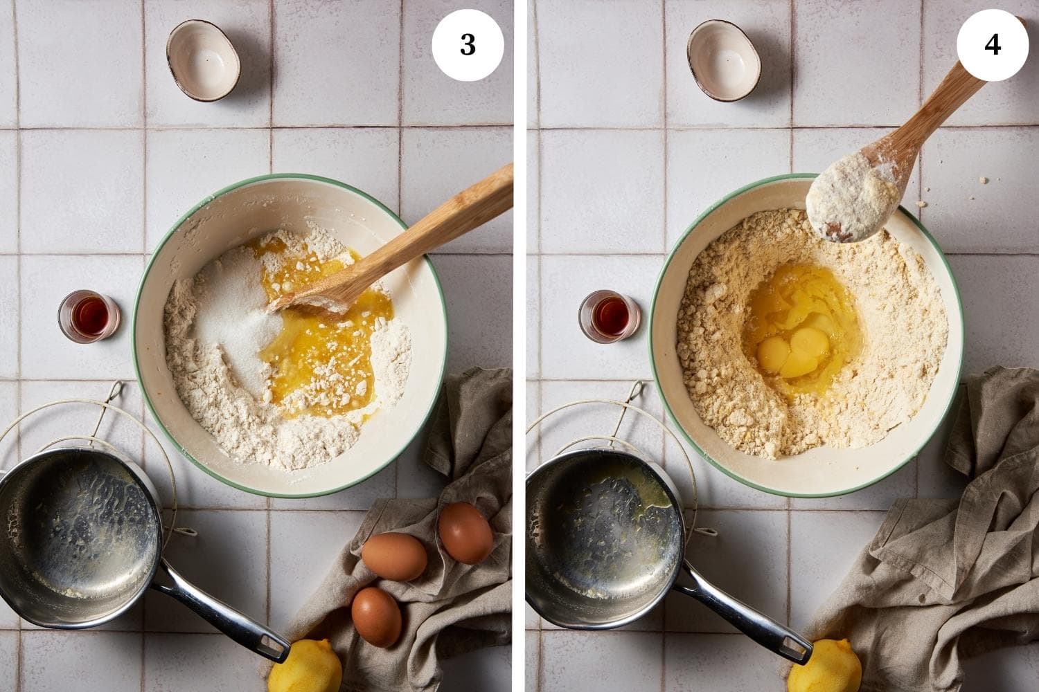 Then add the sugar, the cooled melted butter, and the liquor (photo 3) and stir with a wooden spoon until you get a fairly homogeneous mixture. Create a hole in the center of the flour and add the eggs (photo 4) and stir in well.