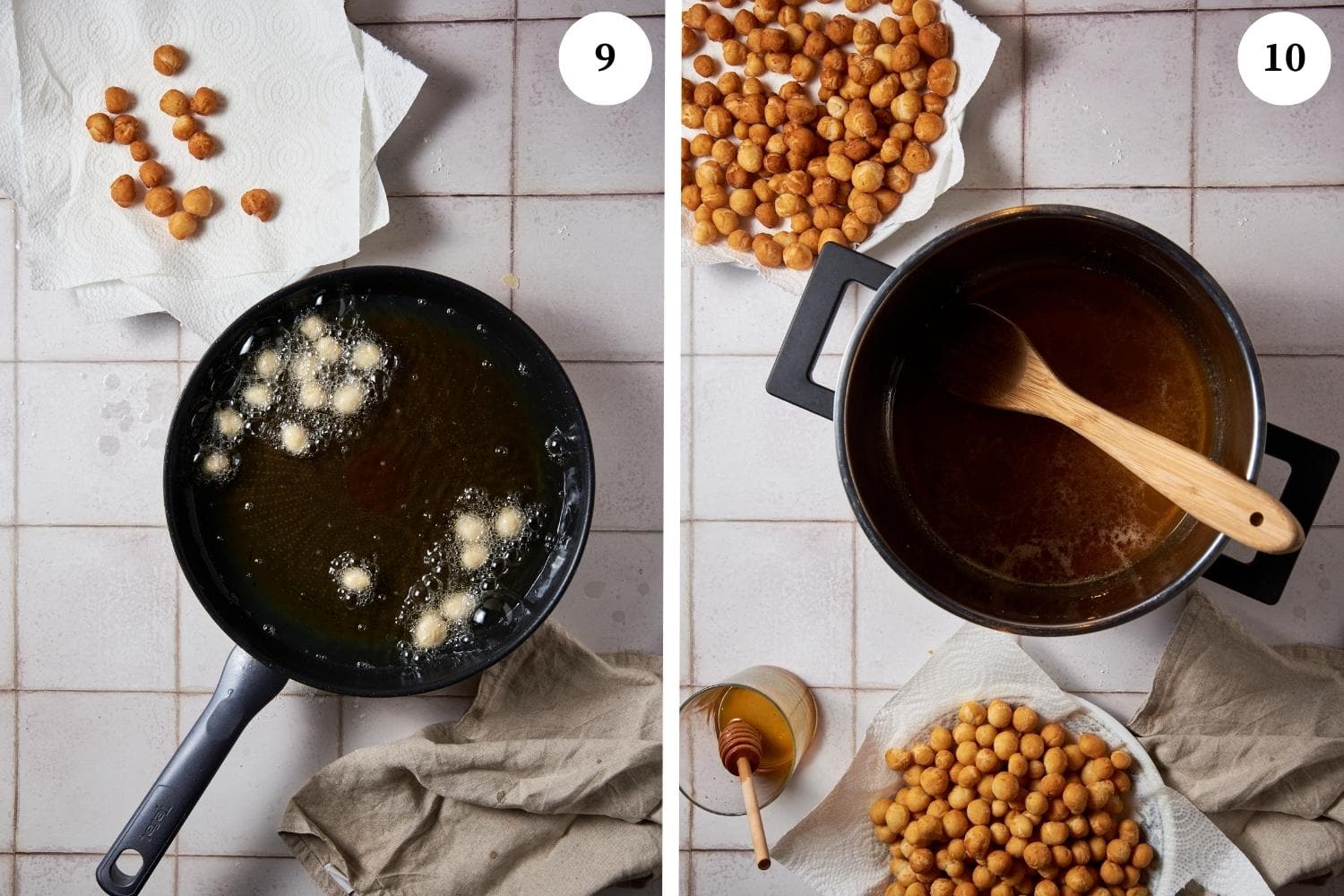 Fry the dough balls in batches of about 15 tiny balls. It should take around one to two minutes per struffoli batch before the dough balls turn a light golden brown (photo 9).