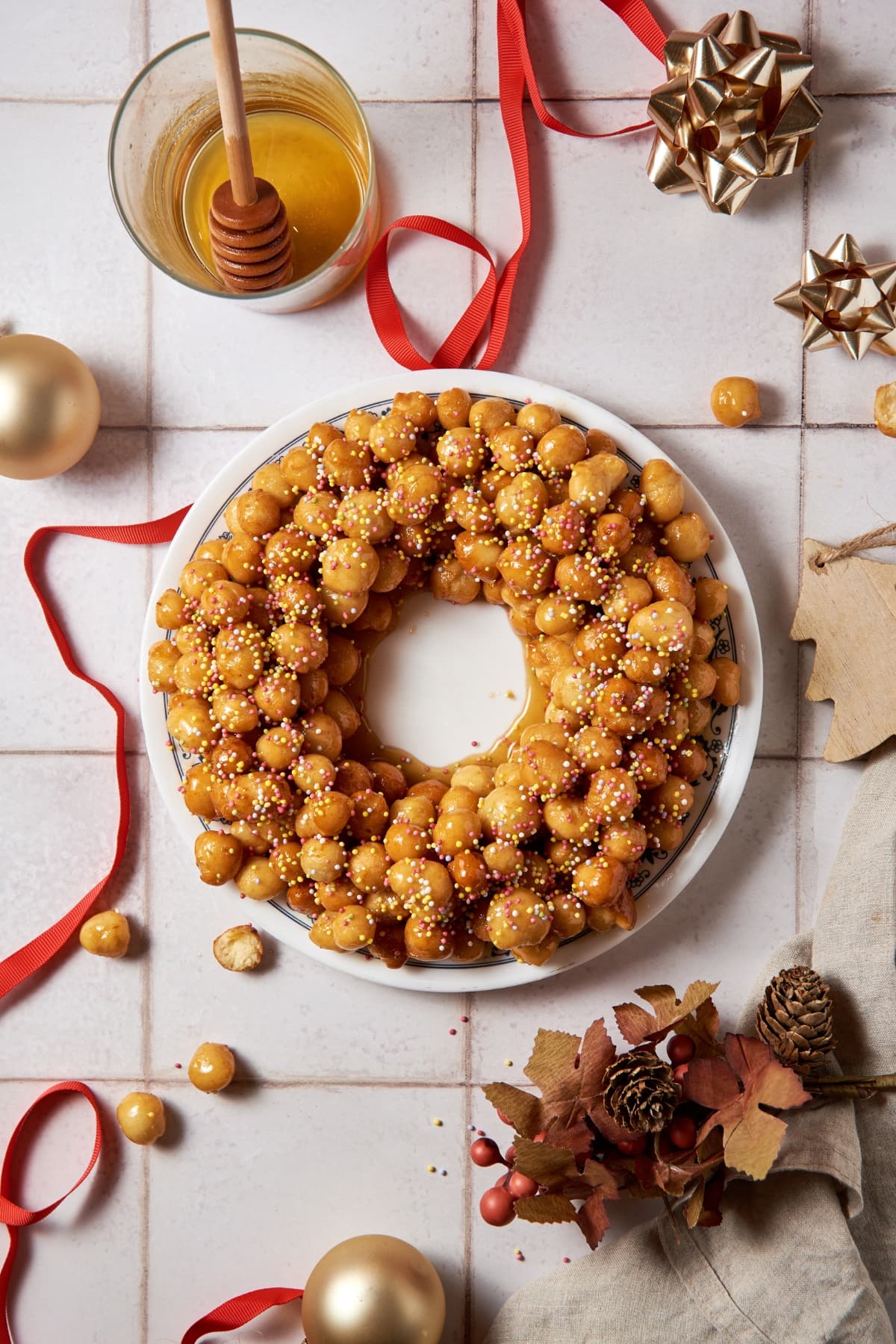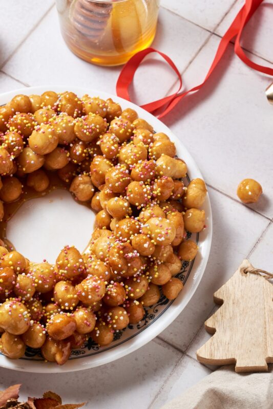 The dough balls are then covered in honey and assembled on a serving plate, one on top of the other, in the shape of a dome or pyramid. The final step is a generous topping of sprinkles, sugar pearls and even candied fruit. This sweet treat is usually served during special occasions or festivities.